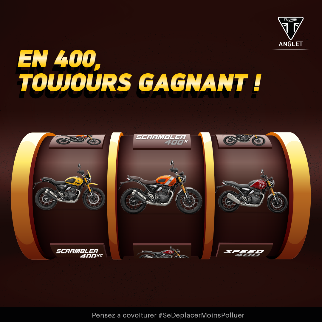 [400] : 𝗧𝗼𝘂𝗷𝗼𝘂𝗿𝘀 𝗚𝗔𝗚𝗡𝗔𝗡𝗧 !Profitez chez 'Triumph Anglet' de nos (très) belles Opportunités en cours sur tous les Modèles de la Gamme 400 :✅ Speed 400.✅ Scrambler 400 X.✅ Scrambler 400 XC.Programmez votre Essai.